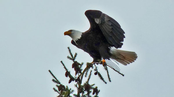 The bedraggled Eagle circled me once - then lit atop a nearby fir tree. He had a six-foot wingspread and looked mighty angry. I was concerned that I might be his next target, but he was so exhausted he just stared at me. Then I wondered if he would topple to the ground. As he tried to dry his feathers, it seemed to me that this beleaguered Eagle symbolized America in its current trials.