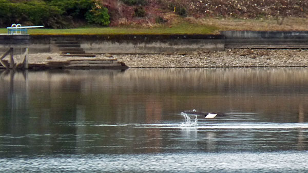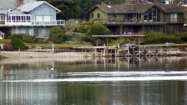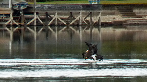 After several minutes the Eagles got frustrated and began to attack each other. They soon began to dive vertically, level out, and attack head-on in a good old-fashioned game of high-speed "Chicken". Sometimes they banked away from each other at the last possible second. Other times they'd climb vertically and tear into each other while falling back toward the water. (The duck catches his breath at the right side of this picture.)