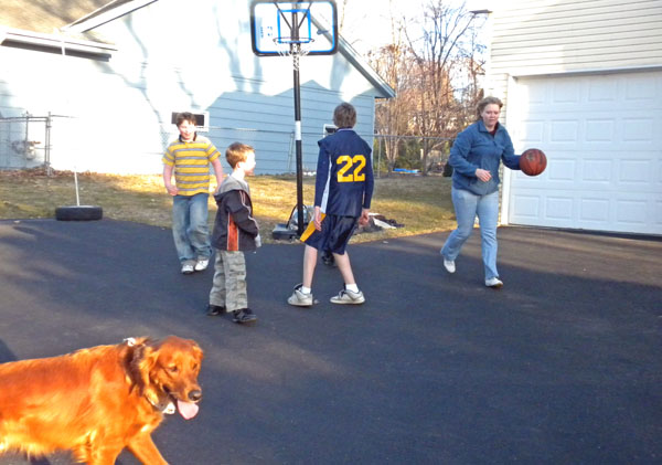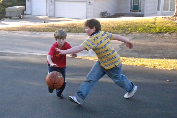 When we get bored with Ping Pong, we go outside and shoot some baskets with the neighbor boys. Of course, Miss Sheri doesn't ever actually let them have the ball when she plays, but we're pretty certain they enjoy watching her dribble and shoot.