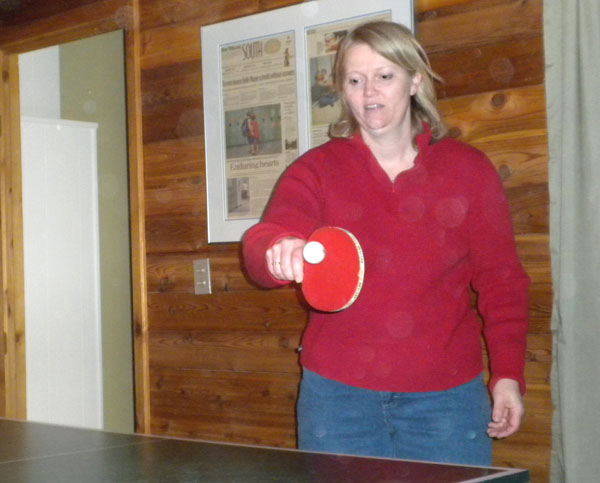 Not to be outdone by her son, Miss Sheri has created a method of "catching" the ping pong ball by having it stick directly to the side of her paddle. The boys call her a cheater when she does this, but she just tells them to "suck it up!"