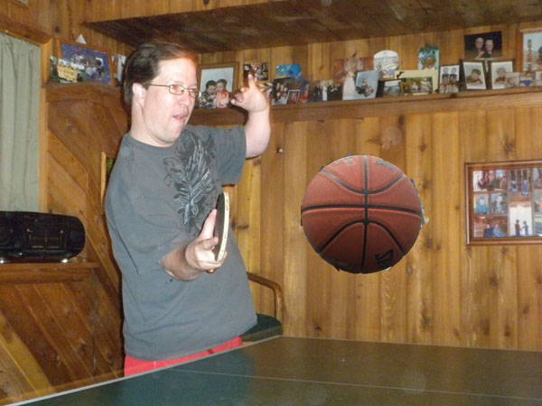 You know we're not up too much when I have to resort to pictures of us playing Ping Pong and basketball to fill up my website update. In this photo, you'll see Avery get very excited just as the corner of the ping pong table is about to pierce through the fleshy covering of his ribcage.