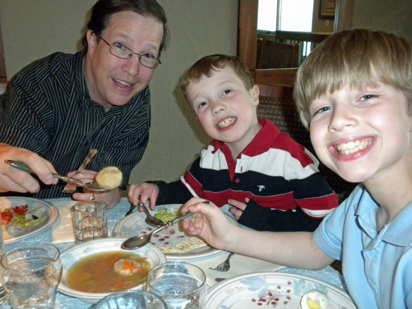 The boys were doing really good participating in all the Seder traditions. Really good that is until the Matzah balls were served. Luke turned to me and whispered, "What are those?" I whispered back, "Ostrich Eyeballs." For some reason, the boys then lost their appetites. Kids are so gullible.