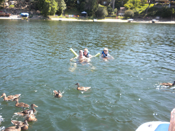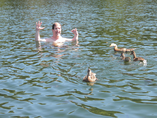 The boys and I manned up and jumped into the water for the first time this year. The water temperature was a whopping 74 degrees, so the shrinkage factor was kept to a relative minimum. We were all fine and dandy until we were suddenly swarmed by a mad flock of deadly ducks who swooped in and started demanding food from us. It was a bit terrifying.