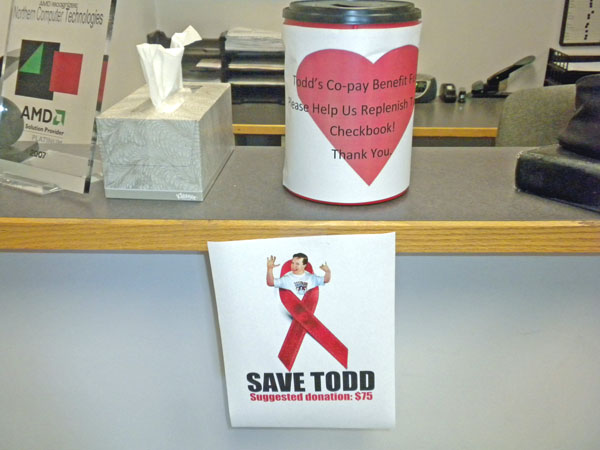 My boss, Dr. David Bollig, accompanied me to the hospital. He swears that when the nurse told me that I had a $75 emergency room co-pay, that my blood pressure shot up momentarily. When he went back to the office, he sent an email to the company that I was doing fine, but I was having a real difficult time dealing with the Co-Pay. So when I came to work on Friday, I saw this donation bucket on the front desk and these "Save Todd" signs plastered all over our offices and warehouse. Best of all, there was almost a whole dollar's worth of pennies in the bucket which is one less dollar that I now have to pay to the hospital! I just love my co-workers!