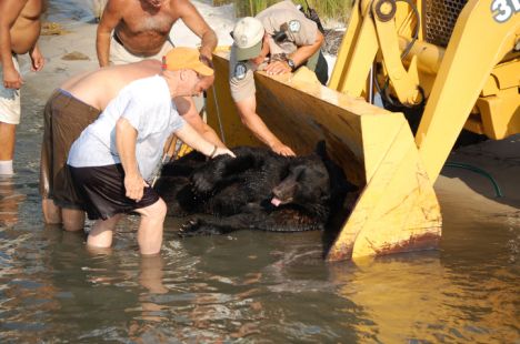Back on dry land, local resident Thad Brett had watched the drama unfold and maneuvered his mechanical digger onto the beach ready to meet the pair. 'I knew how hard it would be to get that bear out,' said Mr Brett. 'I could see he was about waist-deep in the water.' The bear recovered and has been relocated to Florida's Osceola National Forest.' 'We're all pulling for the bear to get adjusted in his new home,' said Mr Warwick.
