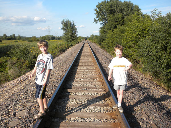 Luke and Avery grew bored with the wood and tires pretty quickly, so I told them to go play on the train tracks instead. They thought that was a good idea until I kept yelling to them that a train was coming. Silly boys are so gullible.