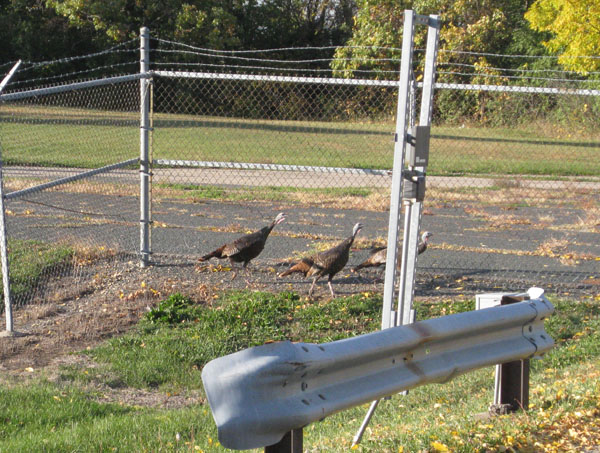 So I'm hanging out at work on Friday, when I suddenly notice three wild turkeys walking along the fence across the street. I can remember a day not too long ago when I had never seen a turkey that wasn't on a farm, but these days they seem to be everywhere! However this was the first time I could stalk a few of them with my camera, so naturally I had to give chase!