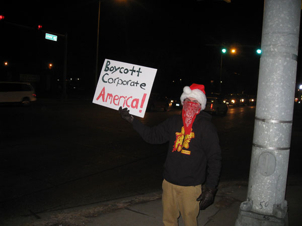 This young man also woke up early on Black Friday, but for a different reason. Apparently he was protesting bargain shoppers and walked back and forth in front of Wal-Mart waving his signs. I asked him if it was all right to take his picture and he said it was fine as long as I didn't get too close. Apparently, he didn't want his face to be seen. Because you just know that if someone at Wal-Mart really knew who he was, they'd get his ass!