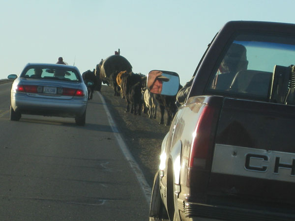 s Eventually they were able to get all the cows together and they followed a tractor dragging a big bale of hay to their destination. Although it might not sound like a very difficult task, walking 40 or so cows down a busy road is a bit of a challenge. Especially when there's impatient drivers who just can't wait for the cows to finish their walk and then decide they'll just try to drive through the herd as this lady in the grey car did. I was curious if one of the bulls would see her flashing red lights and charge the back of her bumper, but it didn't happen.