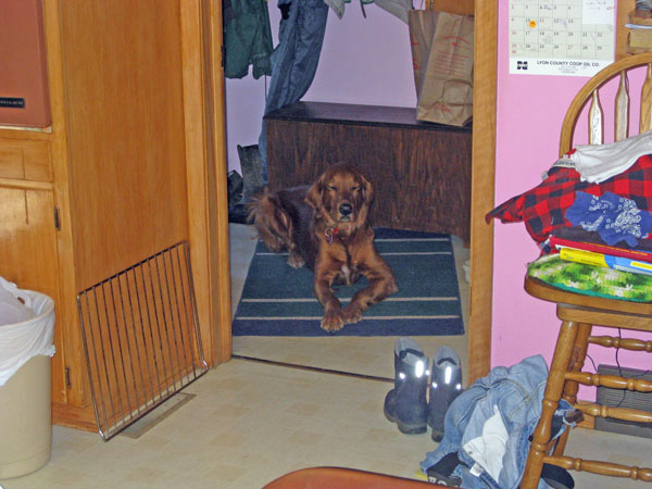 Sunny's position on the farm has markedly improved. He used to be relegated to the cold garage when we'd come to visit. Eventually Grandma and Grandpa though that was too cold, so they allowed him to stay in the house as long as he was locked in the basement. Eventually he worked his way up the stairs and was allowed to stay in the back room as long as we kept the door shut. But now my good dog has earned the right to keep the door open. He knows when he comes to the farm, he's not allowed to leave this room and he stayed in there during our entire four day stay! Some times when no-one is around, I let him sneak forward a couple of feet so he's actually standing in the kitchen. After 30 seconds or so I tell him to go back into his room then we both giggle at our rebelliousness.