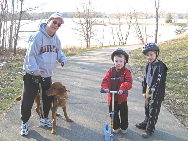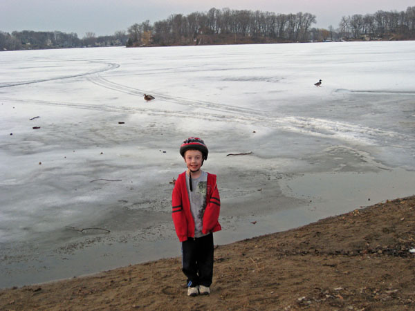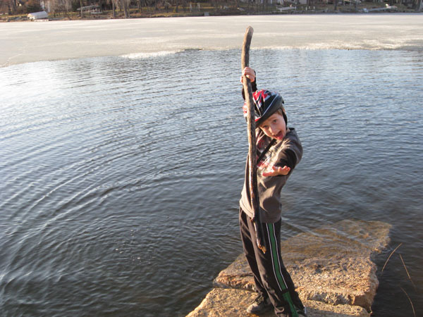 Avery avoided the lake preferring instead to race his bike around the boat launch parking lot. He was lucky to avoid the icy spots otherwise he would have had a good chance to test his helmet!