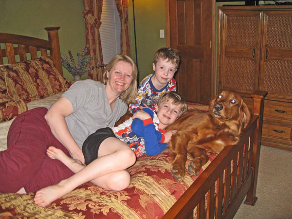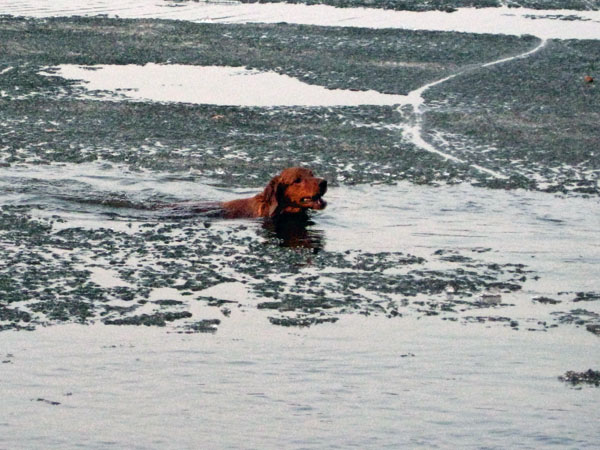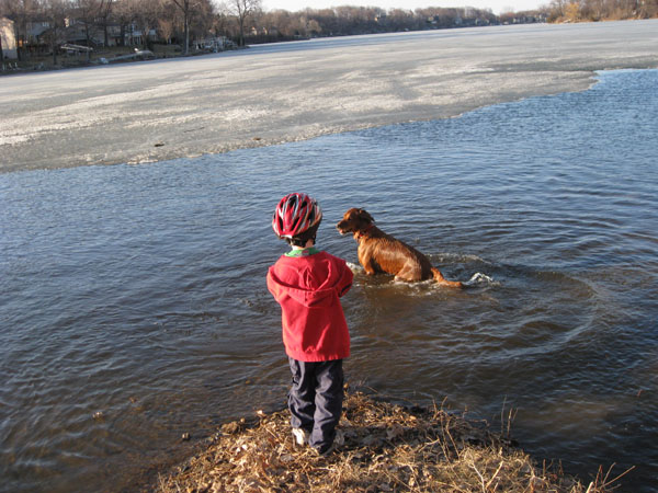 Sunny is impervious to the cold water. We were amazed that he swam in and out of the icy layers without complaint. The boys kept throwing sticks farther and farther into the ice to see if he'd get stuck. I was thinking "If he does get stuck, I'll be the moron who has to swim out and save him." But they were all having so much fun, I didn't have the heart to stop them.