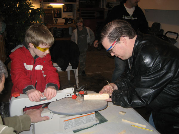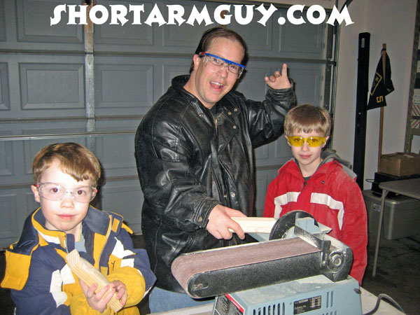 On Saturday, we spent the afternoon making cars for the annual Cub Scout pinewood Derby Race next weekend! I just love pushing blocks of wood through a rapidly moving band saw that just seems to be more than eager to rip into one of my eight remaining digits! Luckily, I was able to cut up their wood without cutting up any Shortarmguy Flesh.