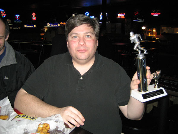 Jay "Bird" Erickson was the Super Bowl Champ in our league this year riding the backs of players like Randy Moss, Jamal Lewis, and David Garrard to the ultimate victory. My team had a 9-4 record during the regular season, but I just couldn't put together a victory when it mattered in the playoffs. Although I was very happy for Jay's Glorious Season, losing makes me very, very sad on the inside.