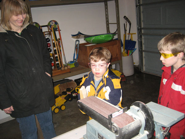 Luke wasn't quite so lucky. Since the boys are older now, we let them use the belt sander on their own to help shape the bodies of their cars. Luke was doing a great job and used the sander with success for quite awhile. Then suddenly he lost his grip on the block and pushed his hand into the belt shaving off a very light layer of his knuckle. It was at that moment that Angry Luke made an appearance and decided that the car had been sanded enough!